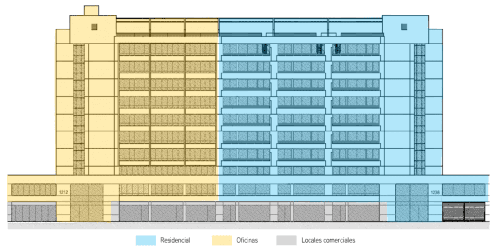 Proyecto Mixto con accesos independientes para departamentos, oficinas y placa comercial.